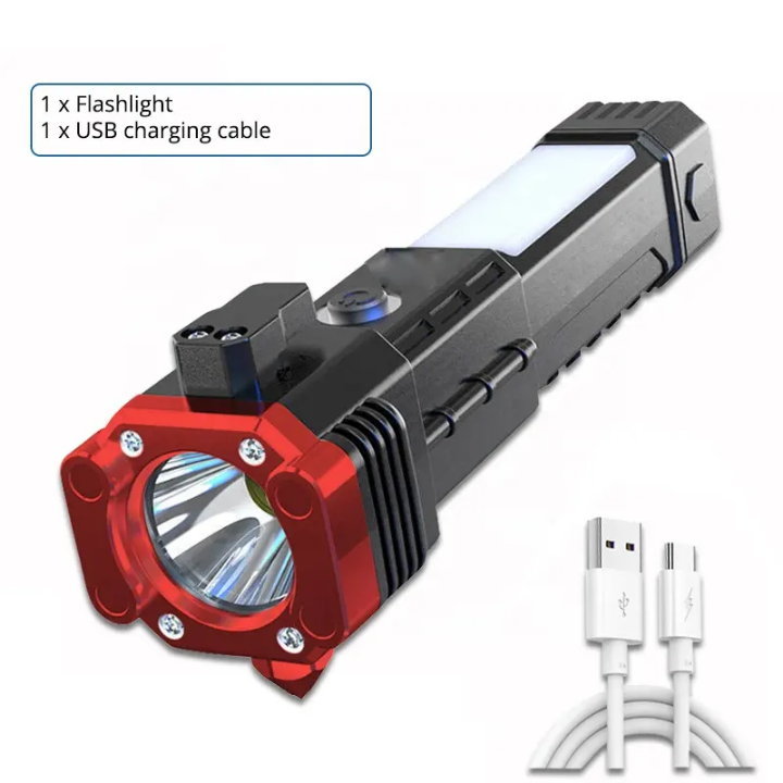 Rechargeable LED Torch Flashlight with Power Bank & Steel Hammer