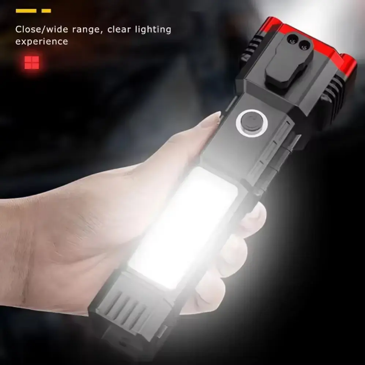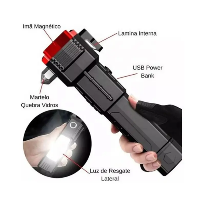 This rechargeable LED torch flashlight is perfect for travel, camping, and emergencies. It features a bright light with adjustable focus, a built-in power bank for charging devices, and a durable steel hammer for safety use. Compact, reliable, and easy to carry anywhere.