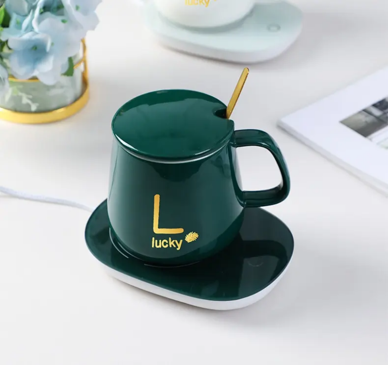 Enjoy your favorite hot beverages with style and convenience using this portable coffee mug warmer companion set. This elegant ceramic mug is designed to keep your drinks warm while adding a touch of luxury to your daily routine. The solid green mug features a beautiful gold "L" and the word "lucky" printed on its surface, symbolizing positivity and charm. Portable coffee mug warmer comes with a matching green lid and a metallic spoon, making it perfect for coffee, tea, or hot chocolate.