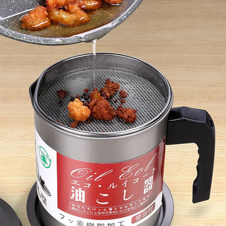 With a generous capacity of around 1.4 liters, it is perfectly suited for home kitchens, handling oil from frying, grilling, or sautéing. The dust-proof lid helps keep the oil protected from dirt and moisture, ensuring better hygiene and longer storage life. For added safety, the oil filter pot includes a non-slip, heat-resistant handle that offers a secure grip even when handling warm oil.